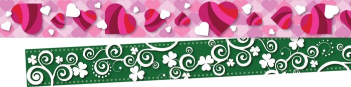 Barker Creek’s Clover & Hearts Double-Sided Trim set includes three packages of their top selling trim and is as stylish as can be! Two of the packages each include thirteen 36″ long x 2.25″ wide strips of trim that feature a sporty scalloped edge for a total of 78 FEET of trim! These packages of trim feature an on-trend design with dots and swirls with coordinating designs on both sides and the colors are Happy Hot Pink and Happy Lime. The third package includes twelve 35″ long x 3″ wide strips of trim for a total of 35 FEET of trim! This package of trim features a side with pink, red and white hearts of various sizes and the other side is a lovely green color with clovers. Mix and match to your hearts content! Border your bulletin boards, frame your doors, accent displays and special projects, decorate your office cubicle, jazz up your children’s rooms at home – the possibilities are endless! Coordinating product available: Search Barker Creek Happy.